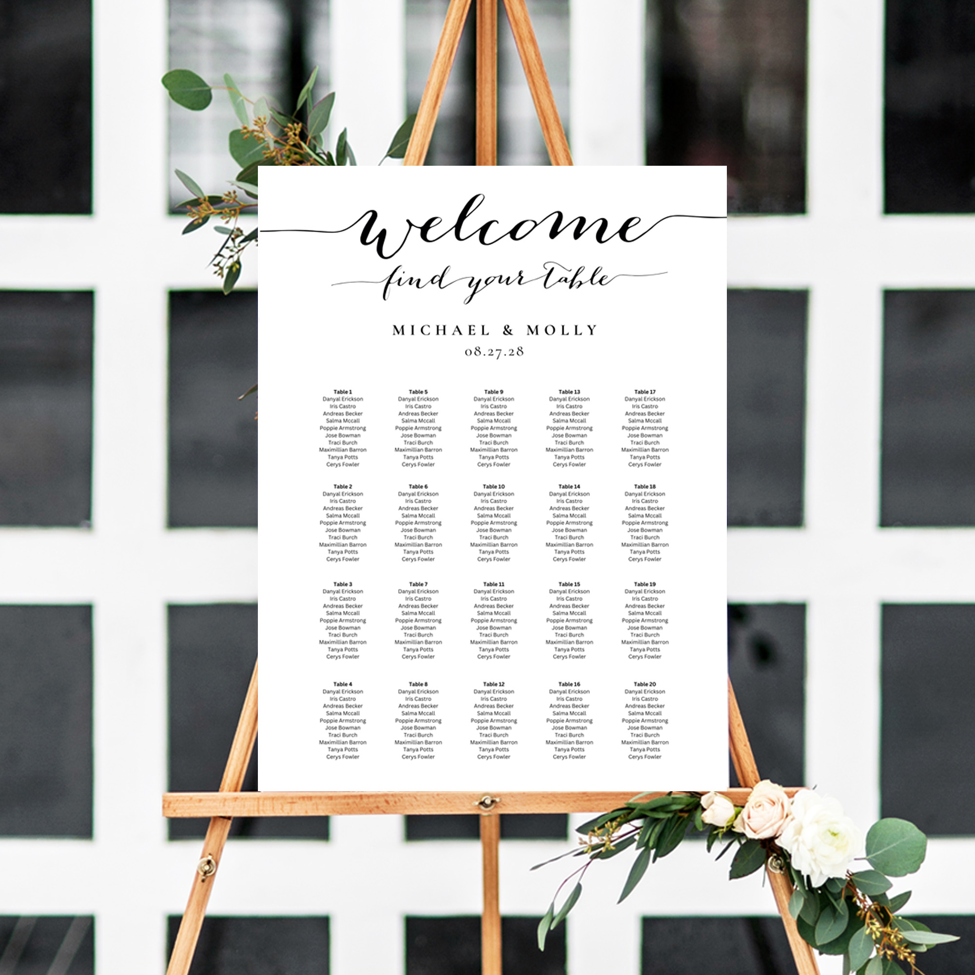 This hand-calligraphy wedding seating chart is perfect for elegant or rustic celebrations. Instantly download, customize, and print or share digitally with ease. Organize your chart by table, alphabetically, or create your own unique table names. Display your finished seating plan in a frame or mount it on foam board for a beautiful easel presentation.